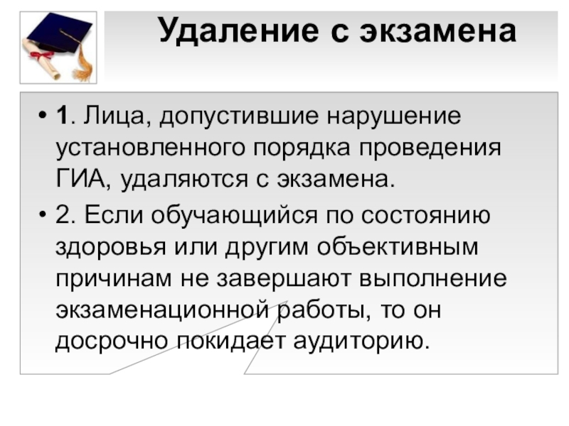 2. Если обучающийся по состоянию здоровья или другим объективным причинам не завершают выполнение экзаменационной работы, то он досрочно покидает аудиторию.