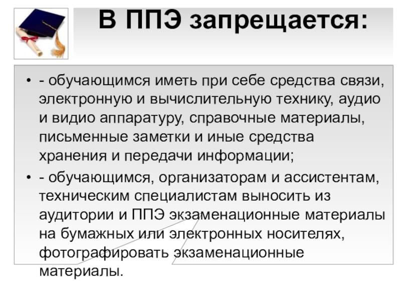 - обучающимся, организаторам и ассистентам, техническим специалистам выносить из аудитории и ППЭ экзаменационные материалы на бумажных или электронных носителях, фотографировать экзаменационные материалы.