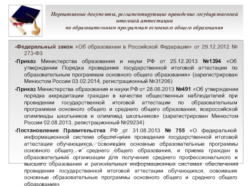 Министерства образования и науки РФ от 25.12.2013 №1394 «Об утверждении Порядка проведения государственной итоговой аттестации по образовательным программам основного общего образования» (зарегистрирован Минюстом России 03.02.2014, регистрационный №31206)
