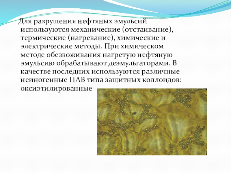 Слайд 8 Для разрушения нефтяных эмульсий используются механические (отстаивание), термические (нагревание),