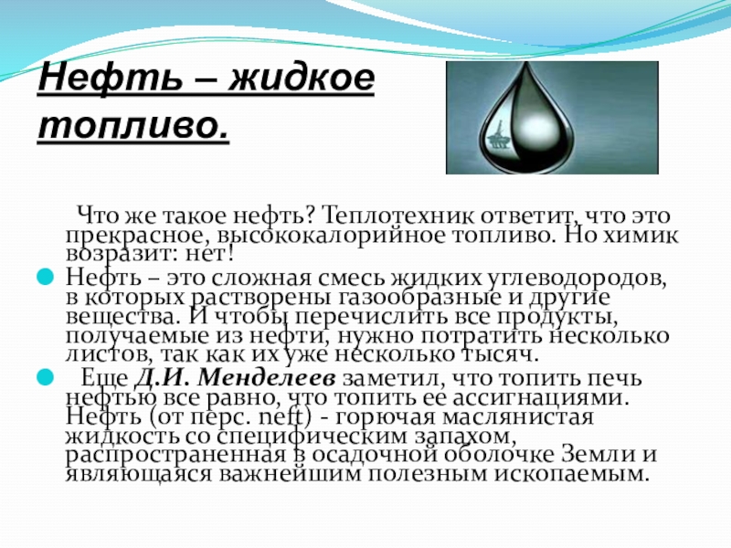 Еще Д.И. Менделеев заметил, что топить печь нефтью все равно, что топить ее ассигнациями. Нефть (от перс. neft) - горючая маслянистая жидкость со специфическим запахом, распространенная в осадочной оболочке Земли и являющаяся важнейшим полезным ископаемым.