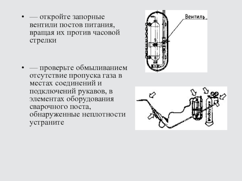 Слайд 18— откройте запорные вентили постов питания, вращая их против часовой стрелки