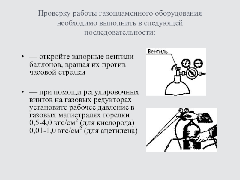 Слайд 17Проверку работы газопламенного оборудования необходимо выполнить в следующей последовательности: