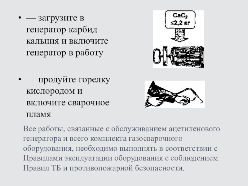 — загрузите в генератор карбид кальция и включите генератор в работу