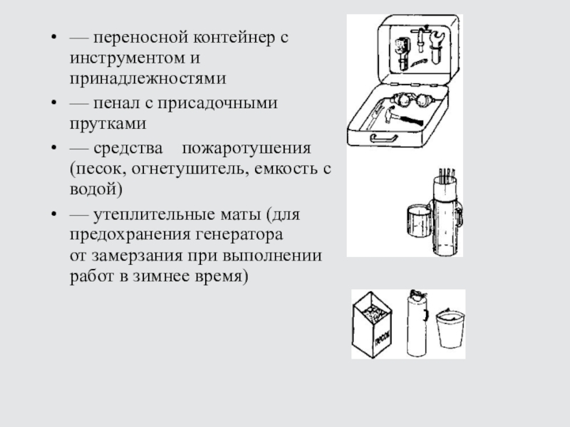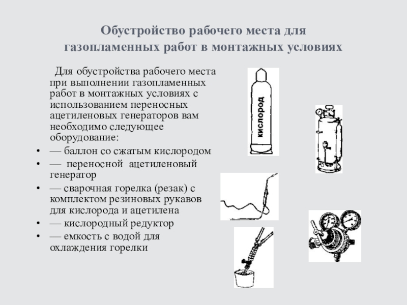 при выполнении газопламенных работ в монтажных условиях с использованием переносных ацетиленовых генераторов вам необходимо следующее оборудование: