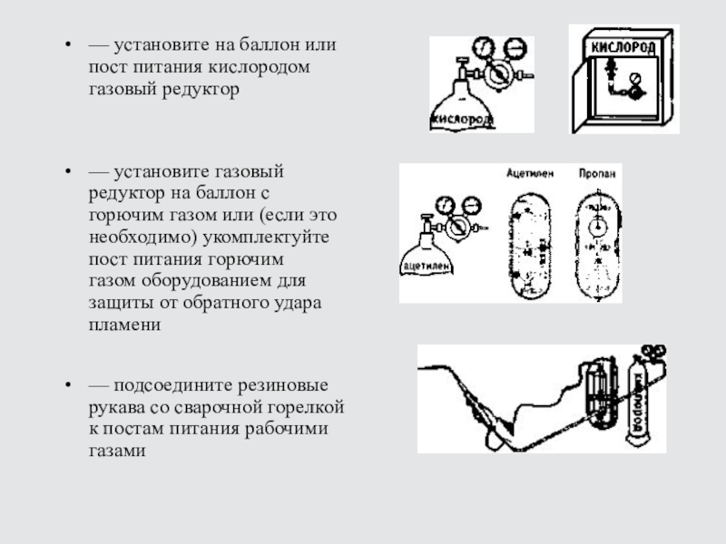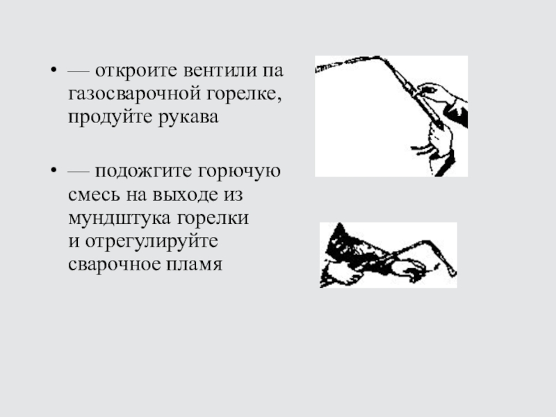Слайд 19— откроите вентили па газосварочной горелке, продуйте рукава