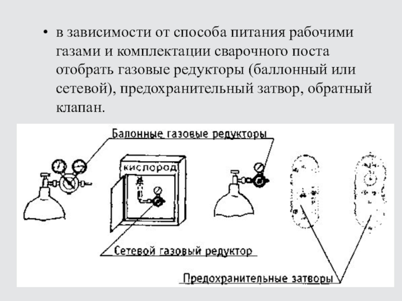 отобрать газовые редукторы (баллонный или сетевой), предохранительный затвор, обратный клапан.