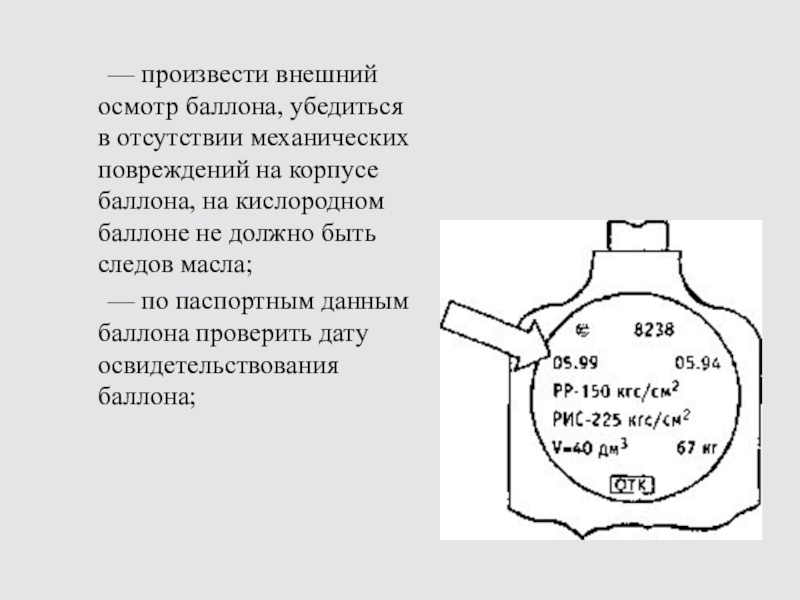 Слайд 3 — произвести внешний осмотр баллона, убедиться в отсутствии механических повреждений на