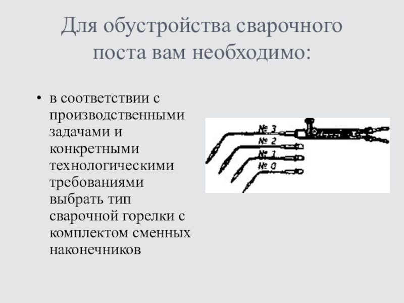 Слайд 10Для обустройства сварочного поста вам необходимо: