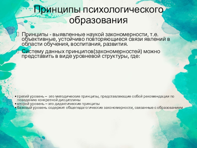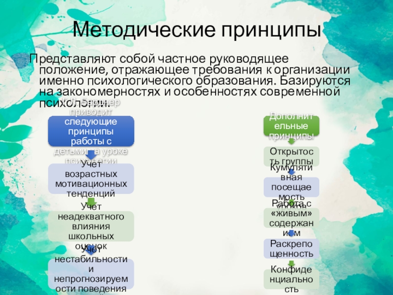 Методические принципыПредставляют собой частное руководящее положение, отражающее требования к организации именно психологического образования. Базируются на закономерностях и
