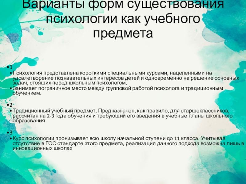 Варианты форм существования психологии как учебного предмета