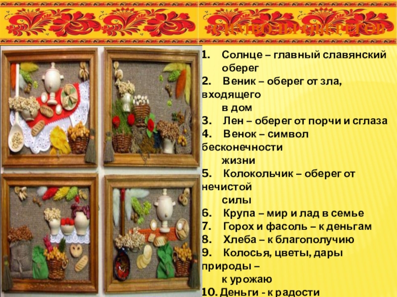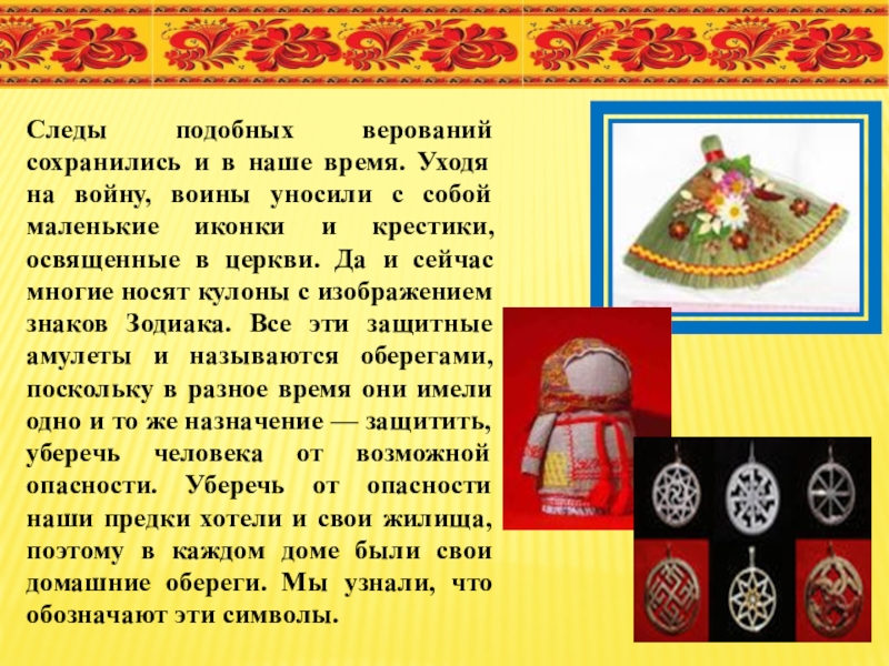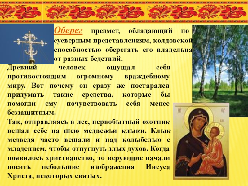 Оберег предмет, обладающий по суеверным представлениям, колдовской способностью оберегать его владельца от разных бедствий.