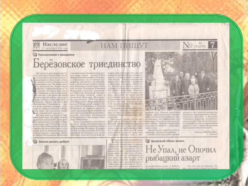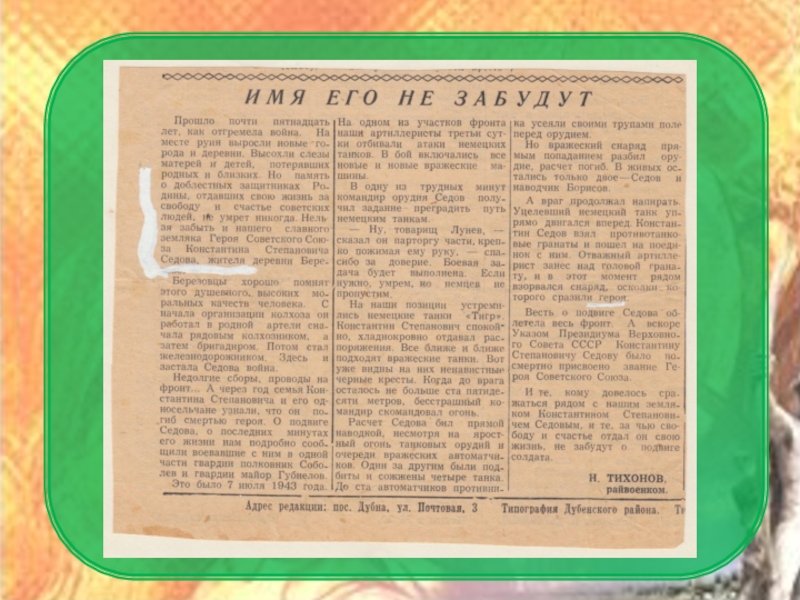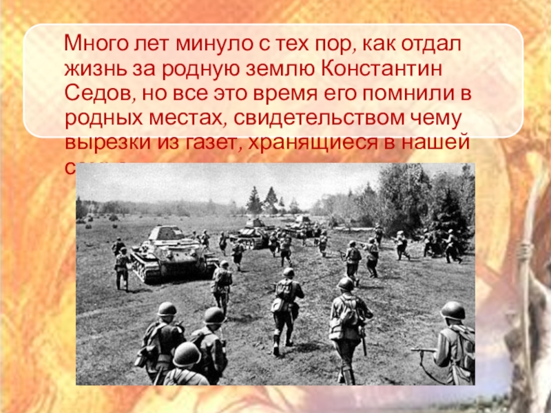 жизнь за родную землю Константин Седов, но все это время его помнили в родных местах, свидетельством чему вырезки из газет, хранящиеся в нашей семье.