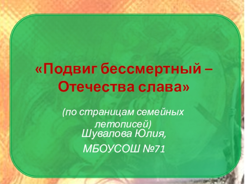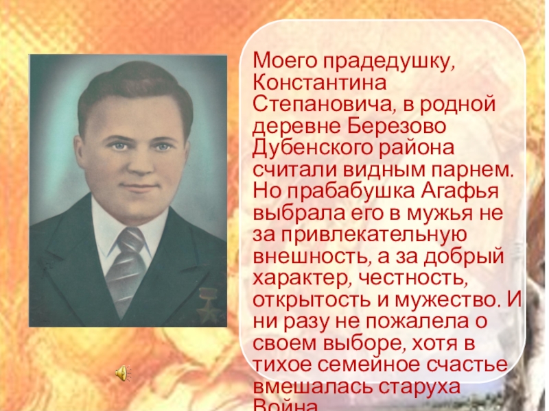 района считали видным парнем. Но прабабушка Агафья выбрала его в мужья не за привлекательную внешность, а за добрый характер, честность, открытость и мужество. И ни разу не пожалела о своем выборе, хотя в тихое семейное счастье вмешалась старуха Война…