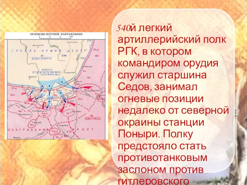 служил старшина Седов, занимал огневые позиции недалеко от северной окраины станции Поныри. Полку предстояло стать противотанковым заслоном против гитлеровского наступления.