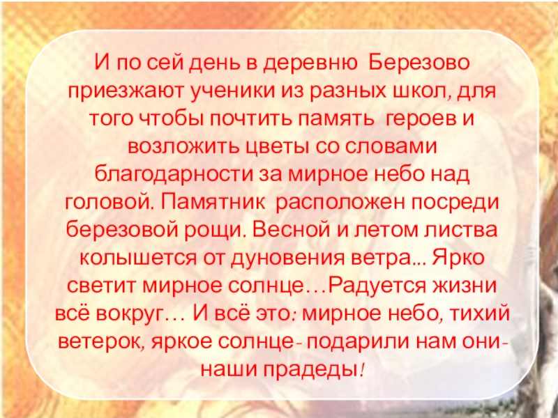 школ, для того чтобы почтить память героев и возложить цветы со словами благодарности за мирное небо над головой. Памятник расположен посреди березовой рощи. Весной и летом листва колышется от дуновения ветра... Ярко светит мирное солнце…Радуется жизни всё вокруг… И всё это: мирное небо, тихий ветерок, яркое солнце- подарили нам они-наши прадеды!