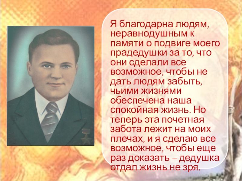 моего прадедушки за то, что они сделали все возможное, чтобы не дать людям забыть, чьими жизнями обеспечена наша спокойная жизнь. Но теперь эта почетная забота лежит на моих плечах, и я сделаю все возможное, чтобы еще раз доказать – дедушка отдал жизнь не зря.
