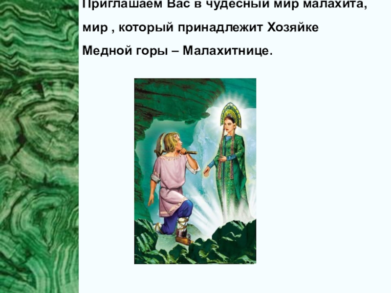 Слайд 2Приглашаем Вас в чудесный мир малахита, мир , который принадлежит Хозяйке