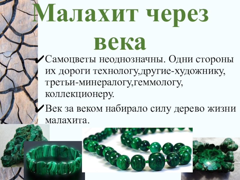 Малахит через векаСамоцветы неоднозначны. Одни стороны их дороги технологу,другие-художнику,третьи-минералогу,геммологу,коллекционеру.Век за веком набирало силу дерево жизни малахита.