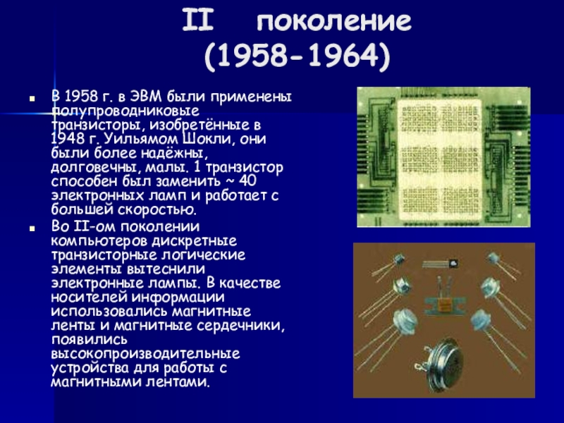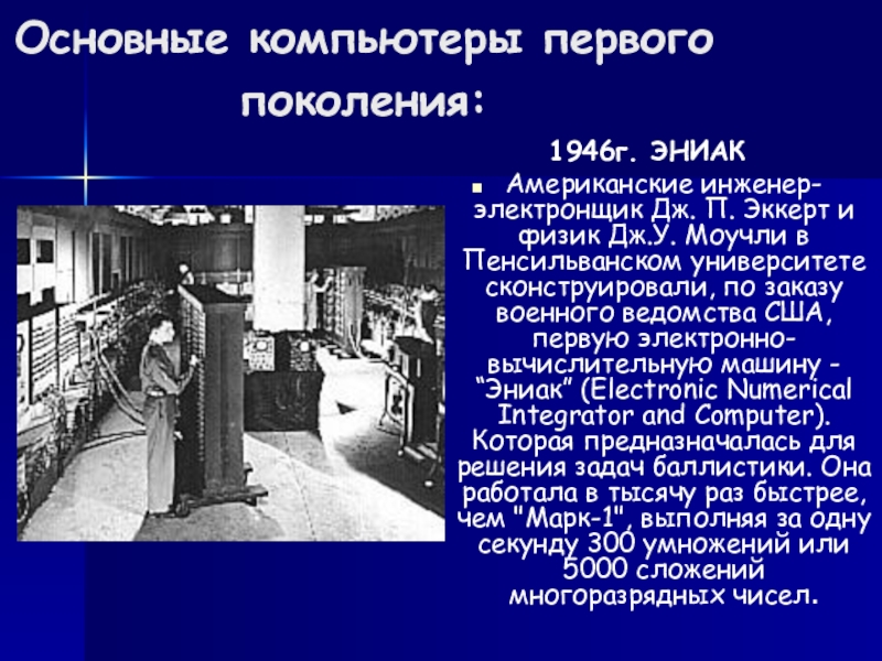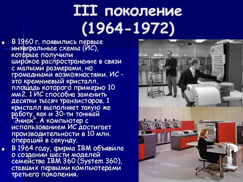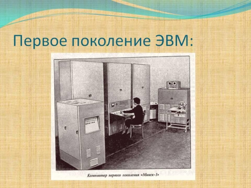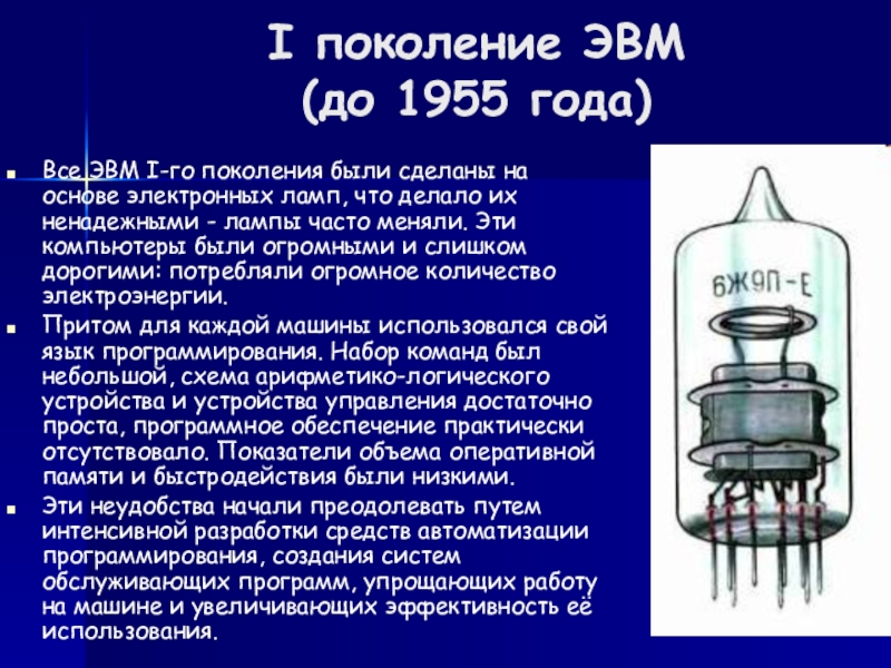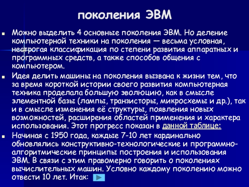 Начиная с 1950 года, каждые 7-10 лет кардинально обновлялись конструктивно-технологические и программно-алгоритмические принципы построения и использования ЭВМ. В связи с этим правомерно говорить о поколениях вычислительных машин. Условно каждому поколению можно отвести 10 лет. Итак: