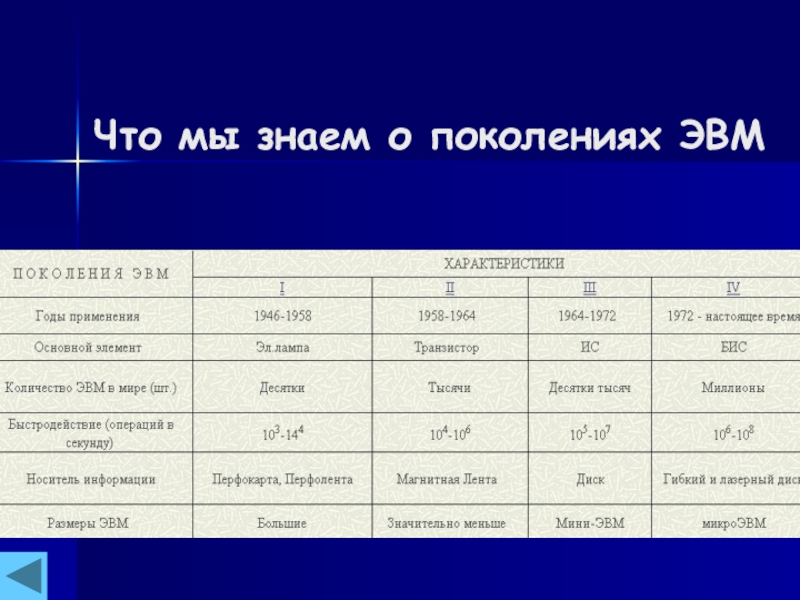 Идея делить машины на поколения вызвана к жизни тем, что за время короткой истории своего развития компьютерная техника проделала большую эволюцию, как в смысле элементной базы (лампы, транзисторы, микросхемы и др.), так и в смысле изменения её структуры, появления новых возможностей, расширения областей применения и характера использования. Этот прогресс показан в данной таблице: