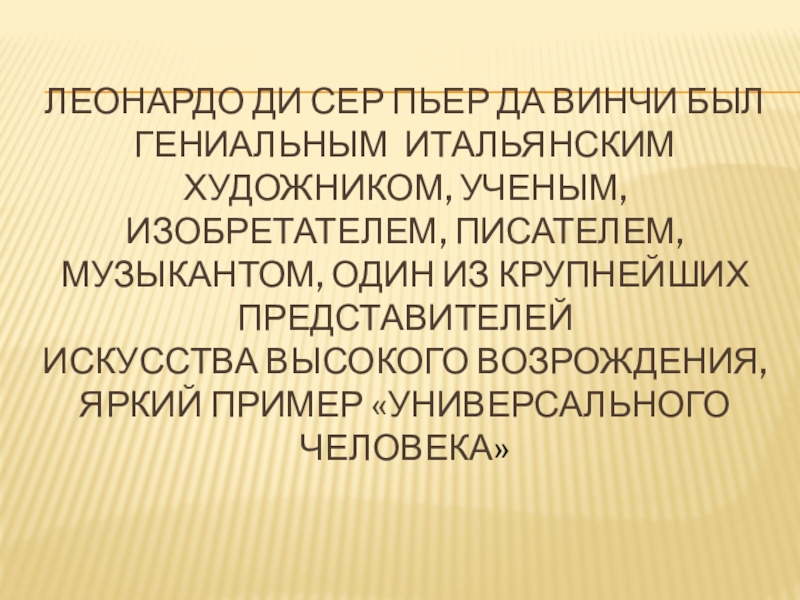 Леонардо ди сер пьер Да Винчи был гениальным  итальянским художником, ученым, изобретателем, писателем, музыкантом, один из крупнейших представителей