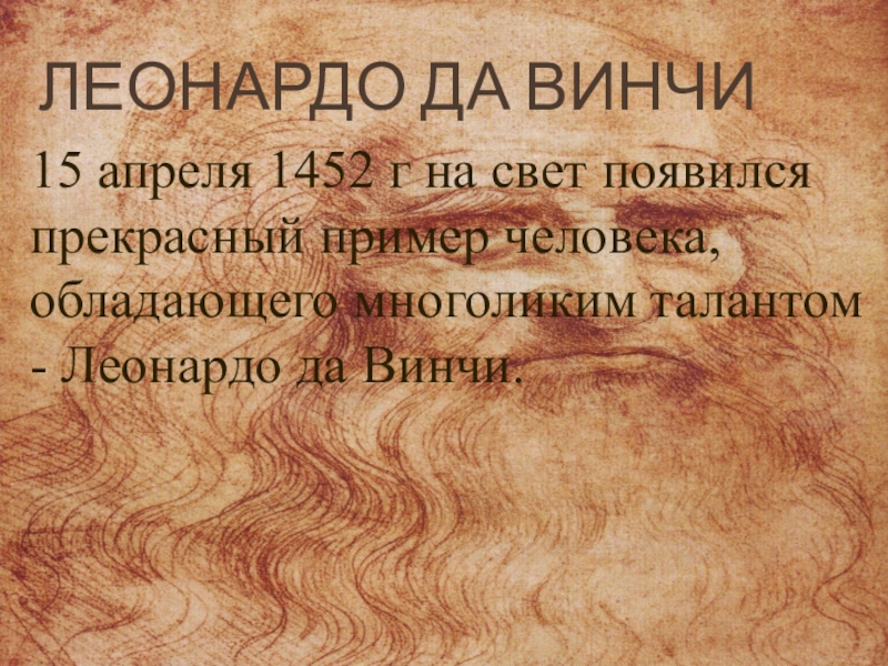 Леонардо да винчи15 апреля 1452 г на свет появился прекрасный пример человека, обладающего многоликим талантом - Леонардо