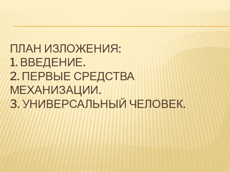 Слайд 3План изложения: 1. Введение. 2. Первые средства механизации. 3. Универсальный человек.