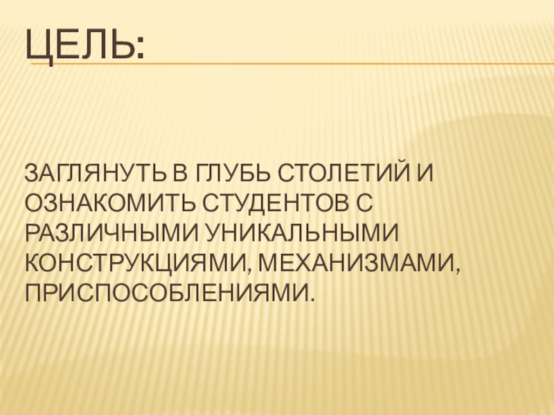 Цель: Заглянуть в глубь столетий и ознакомить студентов с различными уникальными конструкциями, механизмами, приспособлениями.
