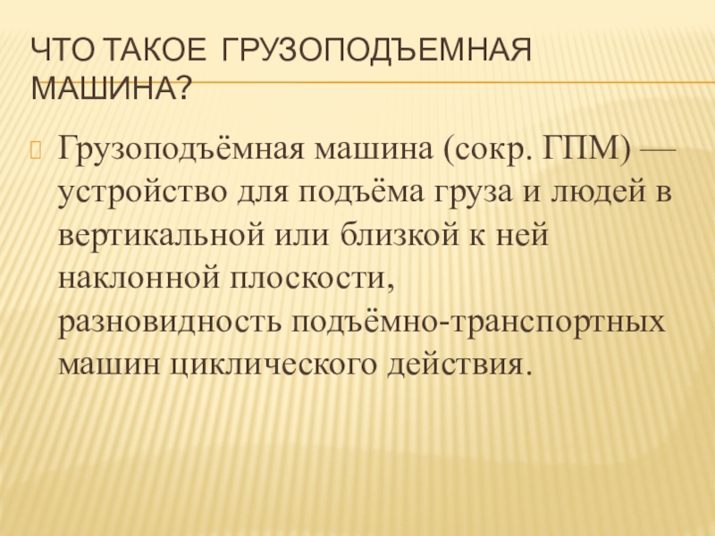 Что такое грузоподъемная машина?Грузоподъёмная машина (сокр. ГПМ) — устройство для подъёма груза и людей в вертикальной или близкой к ней