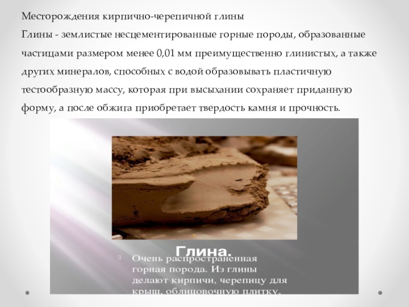 Месторождения кирпично-черепичной глины Глины - землистые несцементированные горные породы, образованные частицами размером менее 0,01 мм преимущественно глинистых, а также других минералов, способных с водой образовывать пластичную тестообразную массу, которая при высыхании сохраняет приданную форму, а после