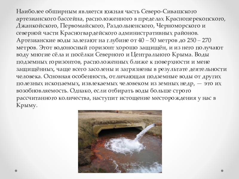 Красноперекопского, Джанкойского, Первомайского, Раздольненского, Черноморского и северной части Красногвардейского административных районов. Артезианские воды залегают на глубине от 40 – 50 метров до 250 – 270 метров. Этот водоносный горизонт хорошо защищён, и из него получают воду многие сёла и посёлки Северного и Центрального Крыма. Воды подземных горизонтов, расположенных ближе к поверхности и мене защищённых, чаще всего засолены и загрязнены в результате деятельности человека. Основная особенность, отличающая подземные воды от других полезных ископаемых, извлекаемых человеком из земных недр, — это их возобновляемость. Однако, если отбирать воды больше строго рассчитанного количества, наступит истощение месторождения у нас в Крыму.