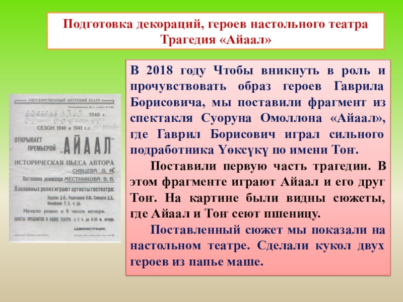 Поставили первую часть трагедии. В этом фрагменте играют Айаал и его друг Тоҥ. На картине были видны сюжеты, где Айаал и Тоҥ сеют пшеницу.