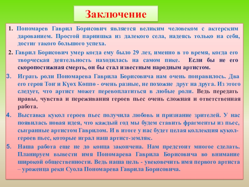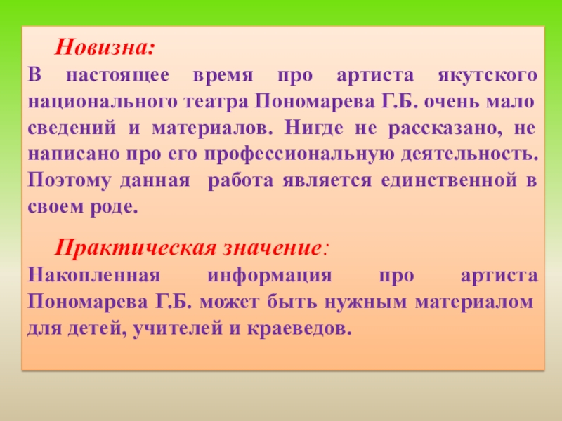 Накопленная информация про артиста Пономарева Г.Б. может быть нужным материалом для детей, учителей и краеведов.