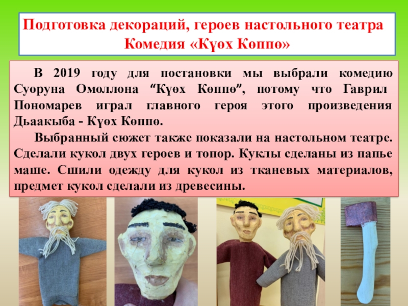 Выбранный сюжет также показали на настольном театре. Сделали кукол двух героев и топор. Куклы сделаны из папье маше. Сшили одежду для кукол из тканевых материалов, предмет кукол сделали из древесины.