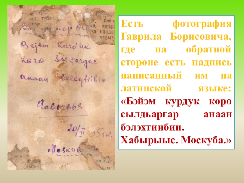 Слайд 17Есть фотография Гаврила Борисовича, где на обратной стороне есть надпись написанный
