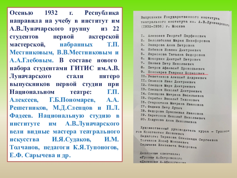 группу из 22 студентов первой актерской мастерской, набранных Т.П.Местниковым, В.В.Местниковым и А.А.Глебовым. В составе нового набора студентами ГИТИС им.А.В.Луначарского стали пятеро выпускников первой студии при Национальном театре: Г.П.Алексеев, Г.Б.Пономарев, А.А.Решетников, М.Д.Слепцов и П.Л.Фадеев. Национальную студию в институте им А.В.Луначарского вели видные мастера театрального искусства И.Я.Судаков, И.М.Толчанов, педагоги К.Я.Тупоногов, Е.Ф. Сарычева и др.
