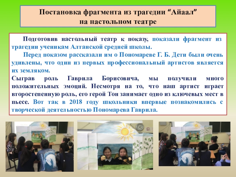 настольный театр к показу, показали фрагмент из комедии во время классных часов. На этот раз, так как Гаврил Борисович играл главную роль, на нас лежала большая ответственность. И мы думаем, что смогли передать то время, когда блистал на сцене Гаврил Пономарев.
