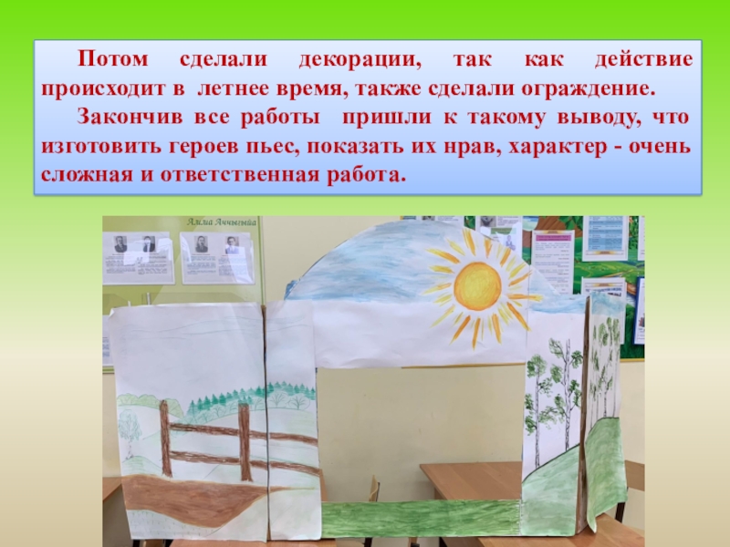 Слайд 27 Потом сделали декорации, так как действие происходит в летнее время, также
