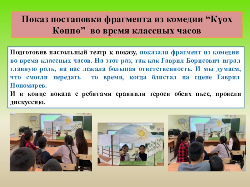 Слайд 28Показ постановки фрагмента из комедии “Күөх Көппө” во время классных часов