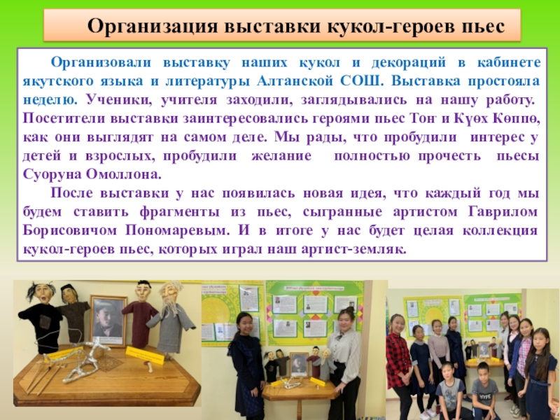 якутского языка и литературы Алтанской СОШ. Выставка простояла неделю. Ученики, учителя заходили, заглядывались на нашу работу. Посетители выставки заинтересовались героями пьес Тоҥ и Күөх Көппө, как они выглядят на самом деле. Мы рады, что пробудили интерес у детей и взрослых, пробудили желание полностью прочесть пьесы Суоруна Омоллона.