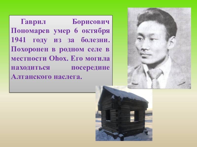 Слайд 16Гаврил Борисович Пономарев умер 6 октября 1941 году из за болезни.
