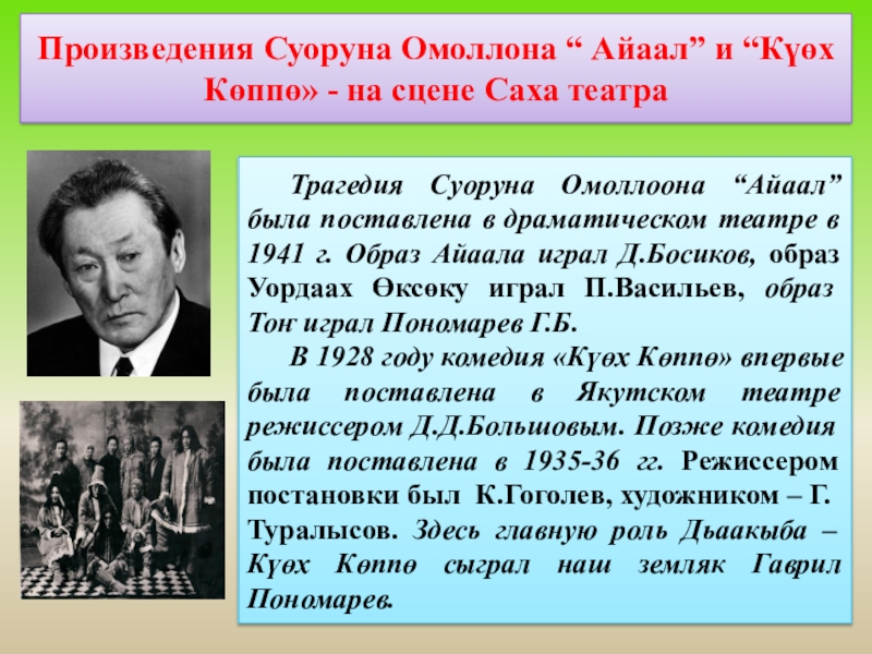 Слайд 21Произведения Суоруна Омоллона “ Айаал” и “Күөх Көппө» - на сцене