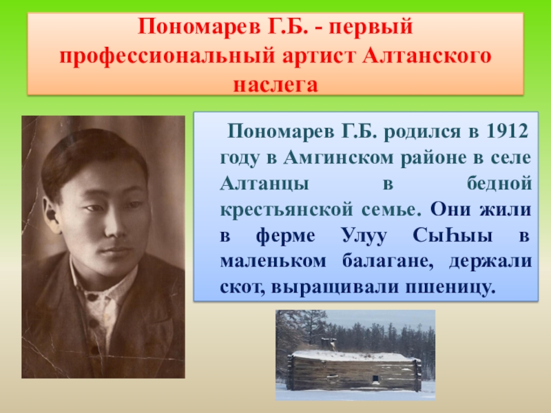 Слайд 5Пономарев Г.Б. - первый профессиональный артист Алтанского наслега