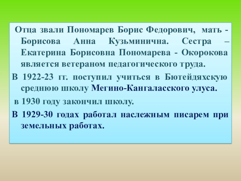 Слайд 6 Отца звали Пономарев Борис Федорович, мать - Борисова Анна