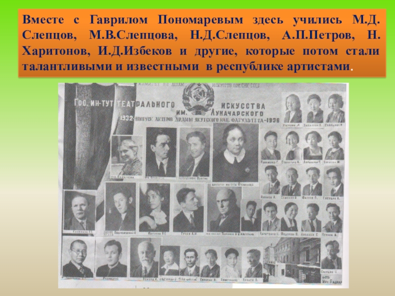 Слайд 11Вместе с Гаврилом Пономаревым здесь учились М.Д.Слепцов, М.В.Слепцова, Н.Д.Слепцов, А.П.Петров, Н.Харитонов,