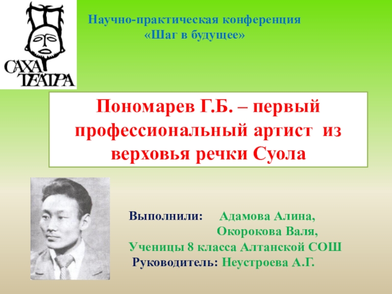 Слайд 1Пономарев Г.Б. – первый профессиональный артист из верховья речки Суола
