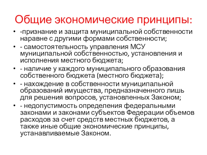 Общие экономические принципы:-признание и защита муниципальной собственности наравне с другими формами собственности;- самостоятельность управления МСУ муниципальной собственностью,