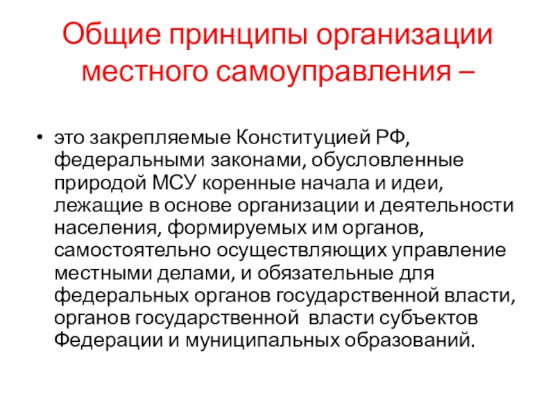 Общие принципы организации местного самоуправления – это закрепляемые Конституцией РФ, федеральными законами, обусловленные природой МСУ коренные начала