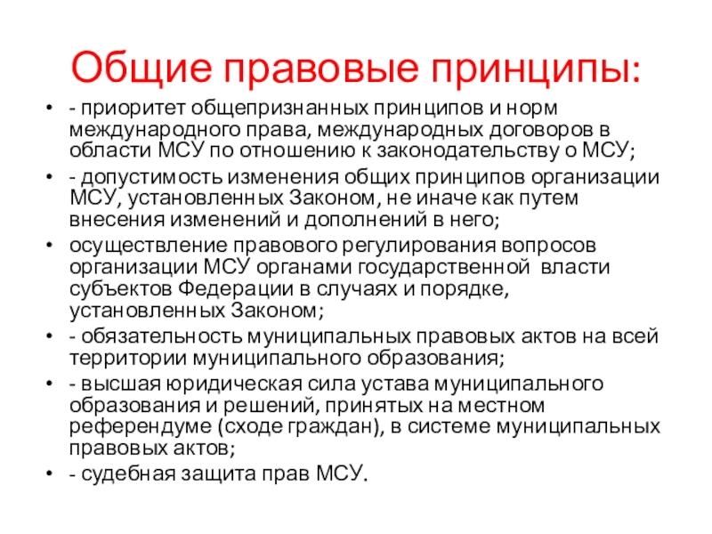 Общие правовые принципы:- приоритет общепризнанных принципов и норм международного права, международных договоров в области МСУ по отношению